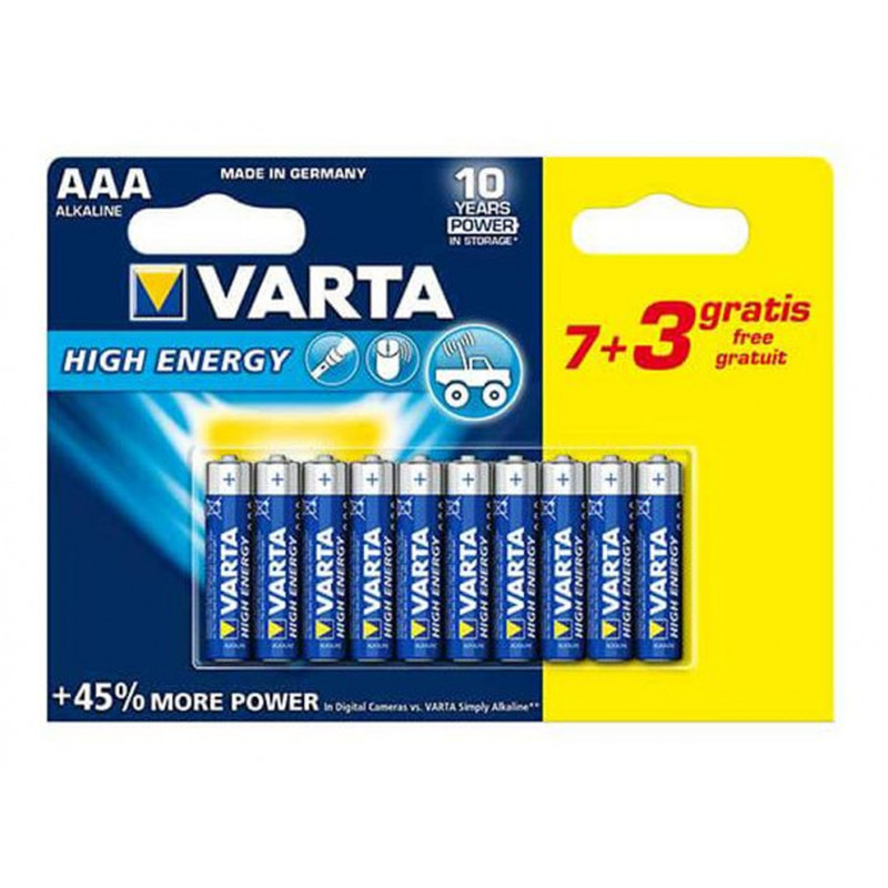 Les piles AAA Varta Alkaline High Energy sont les plus puissantes proposées par la marque. Elles sont conçues pour des appareils gourmands en énergie comme de nombreux jouets ou lampes de poche. Lot économique de 20 piles. Produit unitaire EAN 4008496882175, lot de 2 EAN 3701248200746.