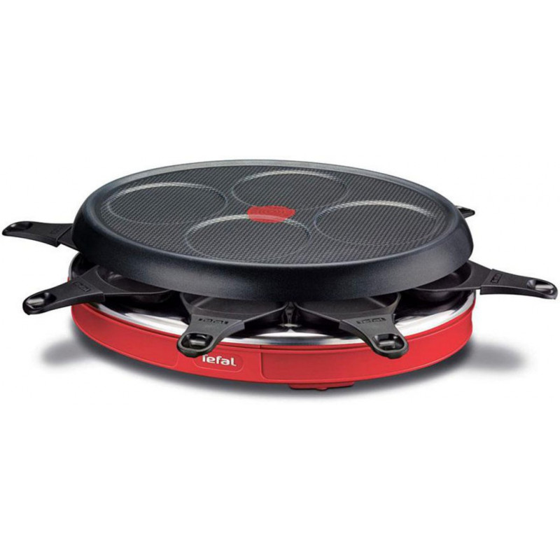 Appareil à raclette pour 8 personnes avec l'indicateur de chauffe Thermo-Spot, un revêtement anti-ahésif efficace compatible au lave-vaiselle, 8 coupelles individuelles pour profiter d'un moment raclette en famille et avec des amis, multifonction: raclette, grill ou crêpes pour varier les plaisirs. EAN 3168431035989.