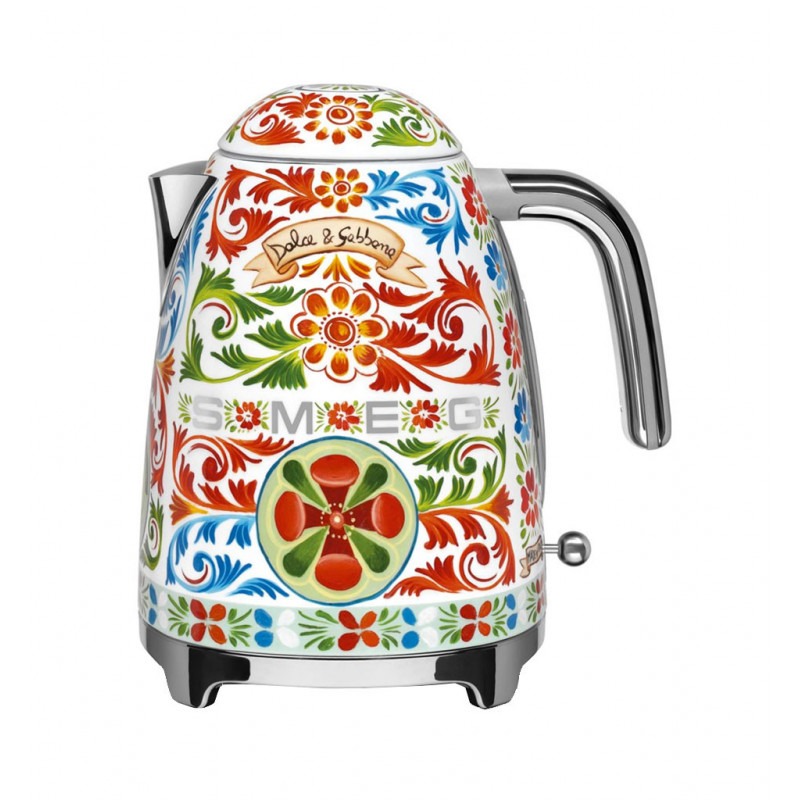 La bouilloire KLF03DGEU s'habille d'un dessus en acier inox verni au look rétro chic coloré inspiré de motifs siciliens traditionnels. La mention Dolce & Gabbana est adroitement intégrée dans le design, tandis que le logo SMEG est pour sa part mis en relief, comme le veut la coutume. Plus qu'un objet déco, cette bouilloire est avant tout un appareil performant et résistant. Avec sa capacité de 1,7 L, elle peut préparer jusqu'à 7 tasses. EAN 8017709248314.