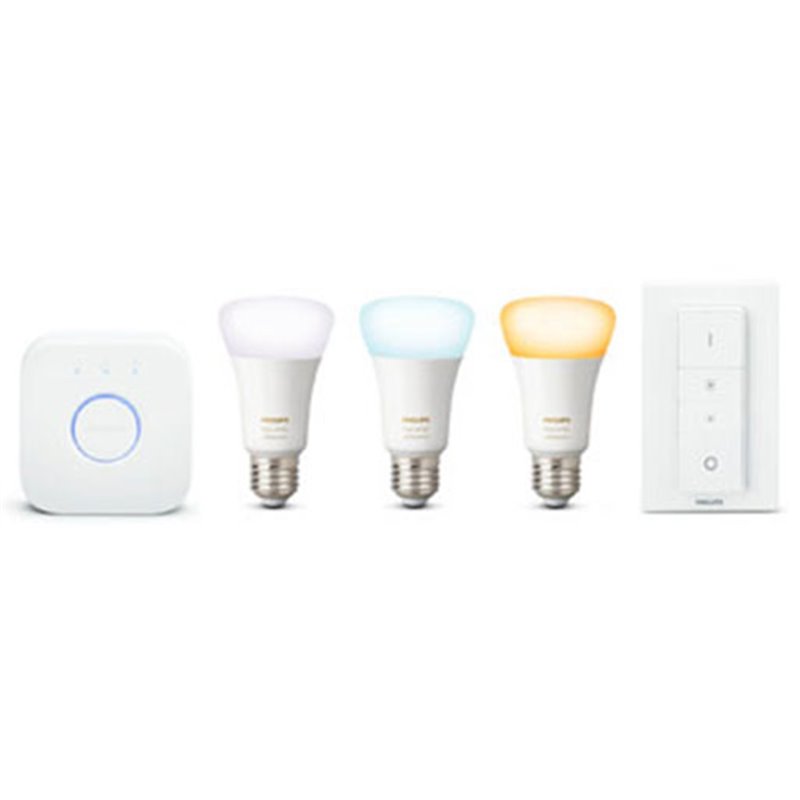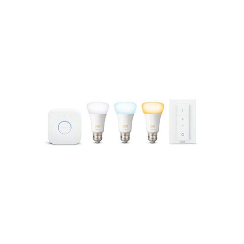 Pack Philips démarrage E27 Hue white & ambiance. Offre spéciale avec extension de garantie à 3 ans. Envie de changer les couleurs de votre intérieur sans forcément repeindre tous les murs " Voilà qui est à la portée du système HUE de PHILIPS qui, depuis 2012, propose une gamme d'éclairages connectés qui vous laissent tout définir de vos ampoules : l'intensité, l'automatisation, les couleurs... même quand vous n'êtes pas là ! À domicile, appuyez sur un interrupteur et les ampoules s'allumeront naturellement, d'une lumière entre le jaune et le blanc. D'apparence, le système d'éclairage HUE de PHILIPS se compose d'ampoules classiques. C'est en passant par votre application depuis votre smartphone ou ordinateur que vous changerez les choses. Elle vous permet en effet d'allumer et d'éteindre toutes vos lampes à distance, mais aussi d'en régler l'intensité lumineuse et la couleur. Type d'ampoule : Ampoule connectée Pack de démarrage : Contient le pont Philips, trois lampes connectées et un variateur Douille : E27 (grande à visser) Classe énergétique : A+ Nombre ampoule : 3 Durée de vie : Jusqu'à 25 000 heures Coloris de l'ampoule : Blanc Eclairage : Blanc à intensité réglable Gamme Philips Hue : White Ambiance Environnement : Apple Home Kit Compatible assistant vocal : Alexa et Google Assistant Livré avec : Pont, câble réseau Ethernet, adaptateur secteur, variateur, 3 ampoules (matériel neuf non déballé, garantie totale 3 ans).