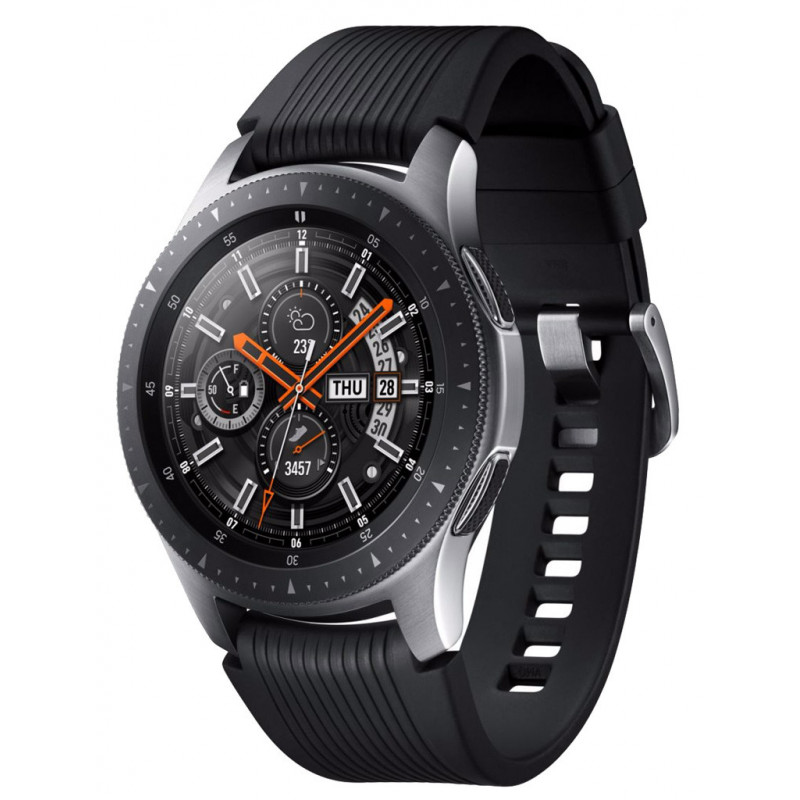 Samsung Galaxy Watch 46mm Gris Acier. Offre spéciale avec extension de garantie à 3 ans. Montre téléphone complète (Lis et envoie SMS et emails), gestion des appels et applis téléchargeables mais aussi définissez et suivez vos performances sportives dans différents sports. - Technologie de l'écran : Super AMOLED Full Color AOD - Affichage : Couleur - Taille de l'écran : 1,3" soit 3,3 cm - Définition de l'écran : 360 x 360 pixels - Taille du cadran : 46 mm - Design de l'écran : Rond - Taille du bracelet : Livré avec 2 tailles : petit et grand - Fermoir : Boucle classique - Personnalisation de l'écran - Affichage de l'heure - Bracelet interchangeable - Compatible : iOS, Android - Gyroscope - Accéléromètre - Altimètre - GPS - Capteur de luminosité - Baromètre - Activité(s) analysée(s) Multisports : course et cyclisme - Cardiofréquencemètre - Analyse du sommeil - Calories : Analyse des calories brûlées - Mesure de la vitesse - Mesure de la distance parcourue - Mesure le temps de course - Connectivité - Wi-Fi - Bluetooth (matériel neuf non déballé, garantie totale 3 ans).