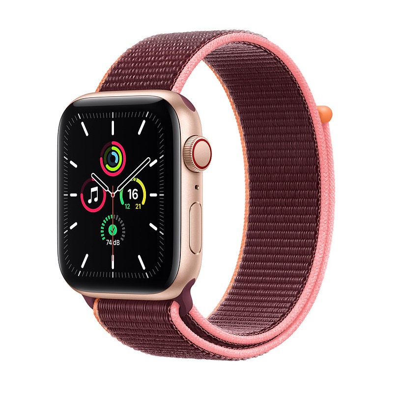 Apple Watch SE GPS Cellular Aluminium Or 44mm Boucle Sport Prune [reference Apple MYEY2] [late 2020] [systeme watchOS 7] GPS/GNSS Etanche jusqu'a 50 metres2 Apple Pay Capacite de 32 Go 44 mm (368 x 448 pixels, surface d'affichage de 977 mm2) Ecran Retina OLED LTPO (luminance de 1 000 nits) Puce SiP S5 avec processeur bicoeur 64 bits Puce sans fil W3 Apple Wi-Fi 802.11b/g/n 2,4 GHz Bluetooth 5.0 LTE et UMTS Batterie au lithium-ion rechargeable integree jusqu'a 18 heures 6 Cable de charge magnetique (materiel neuf, garantie totale 3 ans). EAN 0190199771338.