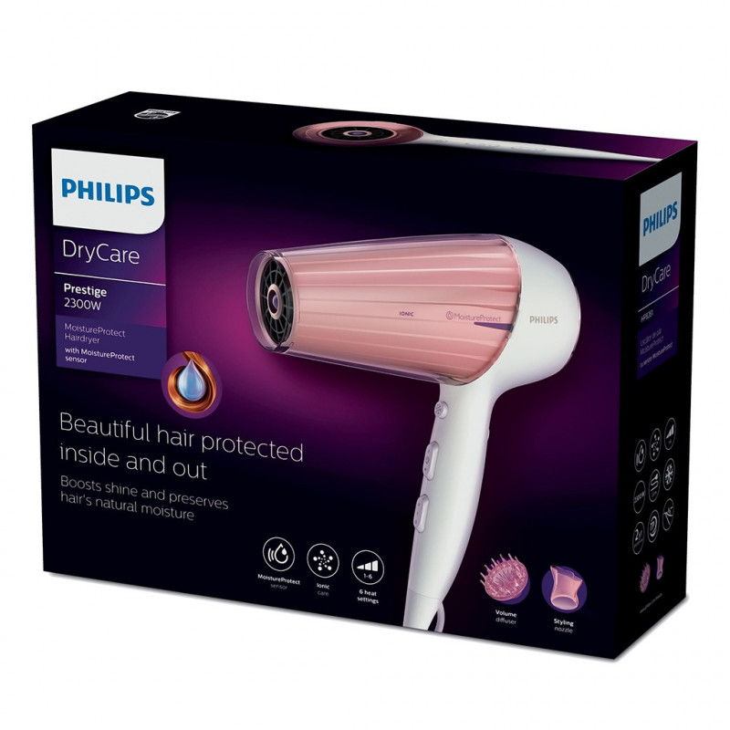 La technologie MoistureProtect contrôle et adapte la température afin de préserver l'hydratation naturelle de vos cheveux. Elle évite que vos cheveux ne surchauffent en maintenant en permanence une température optimale, pour de magnifiques cheveux protégés en profondeur. Le capteur infrarouge MoistureProtect surveille et adapte en permanence la température de séchage en fonction des besoins de vos cheveux. Le capteur intelligent mesure la température vos cheveux pendant que vous les séchez, afin d'éviter qu'ils ne se dessèchent ou que leurs cuticules ne s'abîment. Grâce à une hydratation préservée, vos cheveux restent plus doux, brillants et sains. Vous pouvez activer ou désactiver le capteur en fonction de vos besoins. Produit neuf dans son emballage d'origine bénéficiant de la garantie originale du fabricant. EAN 8710103864950.