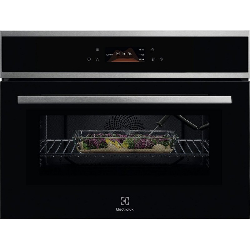 Micro-ondes Combiné ELECTROLUX EVL8E08X: Performance et Polyvalence Technologie Avancée pour une Cuisson Rapide et Efficace Le micro-ondes combiné ELECTROLUX EVL8E08X, de la série 800 MealAssist CombiQuick, révolutionne la cuisine avec sa capacité à cuire jusqu&-39 à deux fois plus vite qu&-39 un four traditionnel. Grâce à sa fonction CombiQuick®, il combine les avantages du micro-ondes et du four pour une cuisson rapide et homogène. Doté d&-39 une puissance de 1000W pour le micro-ondes et de 1900W pour le gril, ce four encastrable en inox anti-trace est idéal pour gratiner, cuire des plats surgelés, ou encore réaliser une cuisson traditionnelle. Son volume utile de 44 litres et ses multiples fonctions de cuisson, allant de la chaleur tournante pulsée à la cuisson basse température, offrent une flexibilité inégalée pour toutes vos recettes. Confort d&-39 Utilisation et Design Élégant L&-39 ELECTROLUX EVL8E08X se distingue par son interface tactile EXCite, qui permet un accès intuitif à ses 100 recettes préprogrammées et à ses réglages automatiques. Son écran LCD blanc et son indicateur de montée en température facilitent le contrôle de la cuisson. Ce modèle est équipé d&-39 une sonde de cuisson intégrée pour une précision optimale, et d&-39 une porte ventilée à trois verres pour une sécurité renforcée. Avec ses dimensions compactes de 45cm de niche, il s&-39 intègre parfaitement dans votre cuisine. Livré avec une grille et une lèchefrite, ce micro-ondes combiné est le choix parfait pour ceux qui recherchent performance et élégance dans un appareil électroménager. Produit neuf dans son emballage d'origine bénéficiant de la garantie originale du fabricant. EAN 7333394115016.